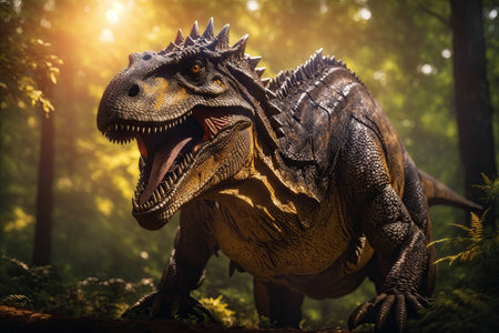 A detailed view of a dinosaur with its mouth wide open, showcasing its sharp teeth and powerful jaw muscles. The image captures the prehistoric reptile in a menacing pose, ready to strike or vocalize in its natural habitat.