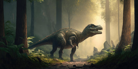 This captivating image depicts a lifelike dinosaur in a serene prehistoric forest, surrounded by lush ferns and enveloped in soft mist, creating an ethereal ambiance.