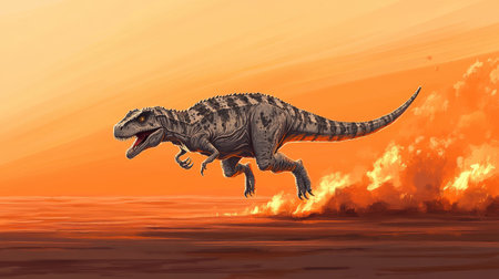 A large dinosaur runs swiftly through a vibrant prehistoric landscape at sunset, with dramatic clouds glowing in orange and yellow hues. The scene captures a moment of intense movement and energy.