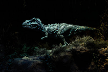 A robotic dinosaur roams a dark, high-tech setting highlighting innovative design and mechanics