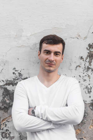 Lifestyle portrait of a young Caucasian man in casual wear on a blurred background of the urban environment.