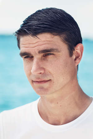 Close-up portrait of one white Caucasian man with dark small eyes and short hair looking away outside by water sea on beach