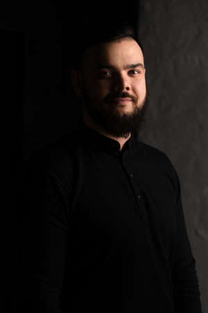 Close-up portrait of a cheerful bearded man, isolated on a dark background.