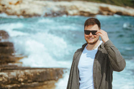 young man in sunglasses with beard portrait at seaside. summer vacation