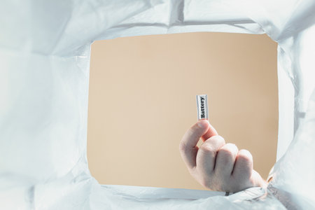 A hand throws a used battery into the trash. Concept of collection and recycling of used batteries. Pollution of the environment. Copy space