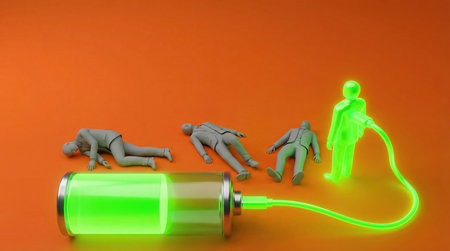 Glowing green businessman plugged into battery charging while others lie tired
