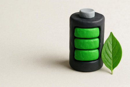 Eco-friendly battery made of plasticine with a green leaf. Space for text