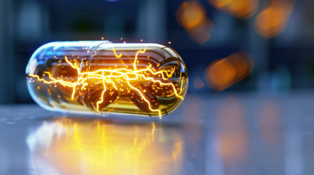 A captivating close-up of a transparent capsule showcasing electric energy sparks inside, embodying the fusion of technology and medicine in a contemporary setting.