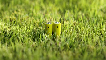 Used AA batteries and proper disposal of environmentally and soil-toxic batteries on a green background. The concept of processing harmful and recyclable objects.