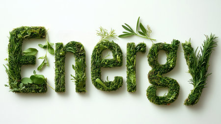 Lush greenery forms the words green energy, showcasing sustainability and nature's beauty.