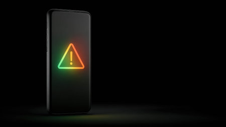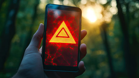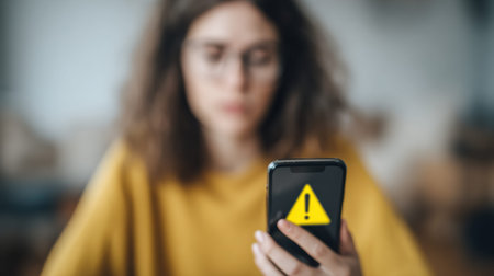 A person is shown holding a smartphone, with a bright digital warning icon displayed above. The image features a shallow depth of field, with the focus on the phone and the hand. The lighting appears to be indoors with a professional setting. Ideal for illustrating digital security or tech related concepts.