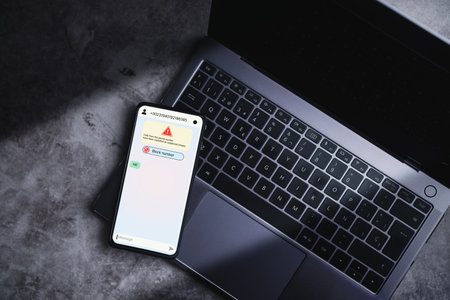 Smartphone laying on laptop receives message from suspected number scam. Unwanted anonymous call. Fraud and phishing phone concept. Message from stranger.