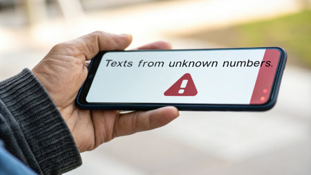 A hand holding a smartphone displaying a fraudulent text message warning emphasizing caution with texts from unknown numbers..
