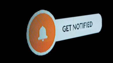Sign template isolated on black background. Animated social media sign with get notified text and cursor clicking on button icon on pixel screen.
