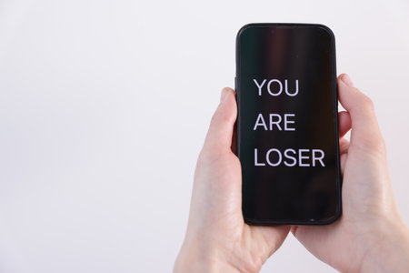 Cyber bullying. Woman holding smartphone with text You Are Loser on white background, closeup. Space for text
