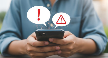 Close-up of hands holding a smartphone displaying two notification bubbles with red warning and exclamation symbols.