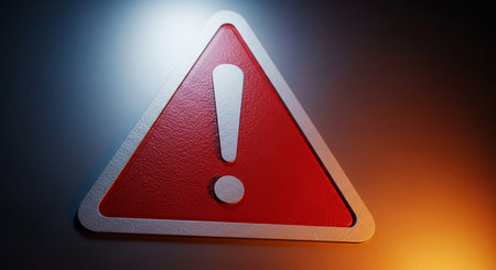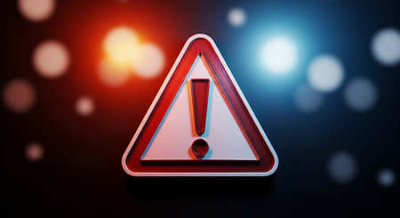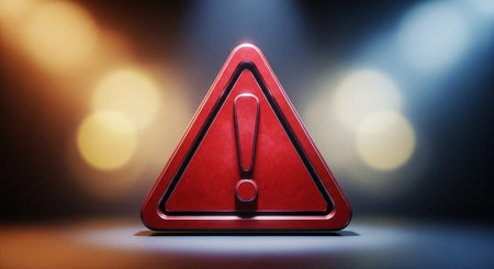 A three-dimensional red triangular warning sign with a prominent exclamation mark, exhibiting a metallic sheen and soft, out-of-focus colored lights...