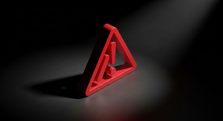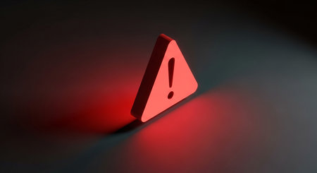 showing red triangular warning sign with black border and exclamation mark symbol on a dark, moody background with glowing red light.