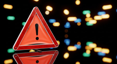 Background showing triangular warning sign with an exclamation mark inside illuminated against a blurred background of golden and red bokeh lights...