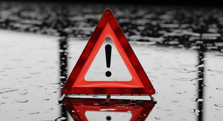 Light showing yellow triangular warning sign with exclamation mark on a wet dark surface with water droplets and bright light reflection.