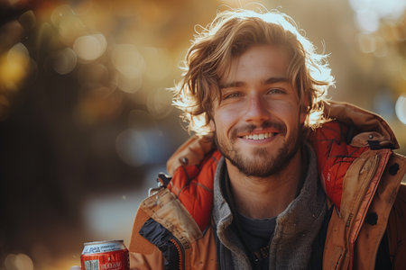 Smiling Man With Long Blonde Hair Holding a Soda Can Outdoors in the Afternoon