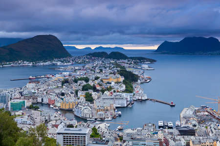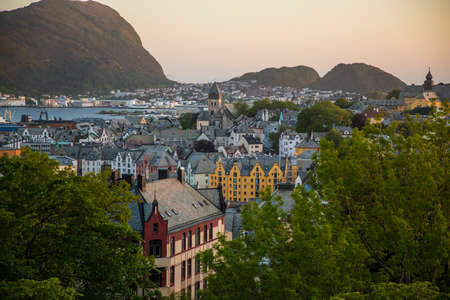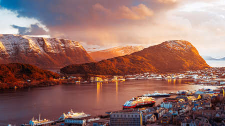 From the bird's eye view of Alesund port town on the west coast of Norway, at the entrance to the Geirangerfjord. Colorful sunset in the Nord. Traveling concept background.