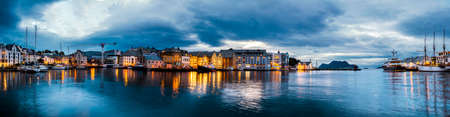 Sunset panorama of Alesund. Scenic view old city with reflection on water
