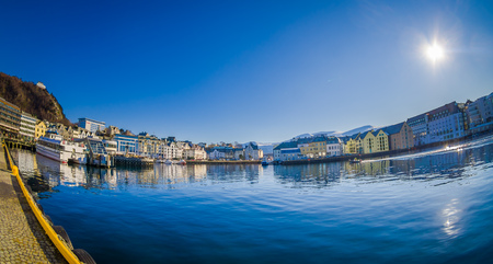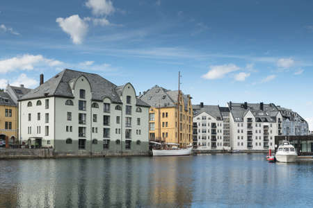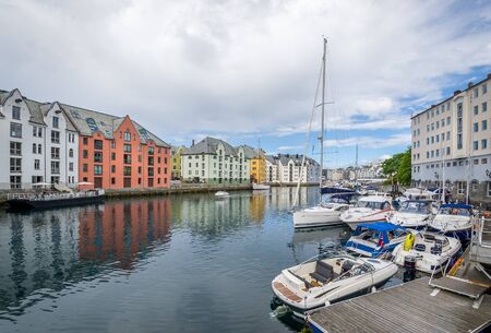 Colorful architecture on the fjord in Alesund, Norway. Beautiful summer landscape