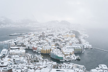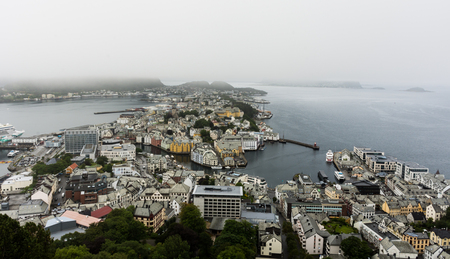 Panoramic view of Ã…lesund, Norway, on a foggy day