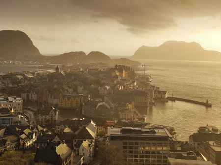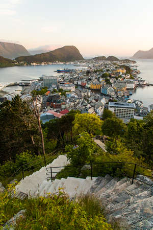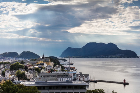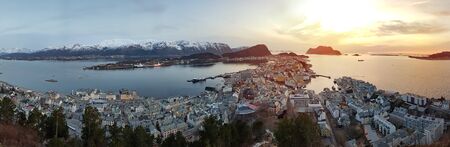 The amazing sunset over Alesund cityscape. Neoclassical and neo-Gothic stone buildings. Art Nouveau architecture. Sun rays illuminate Atlantic Ocean and islands. View from Aksla viewpoint. Norway.