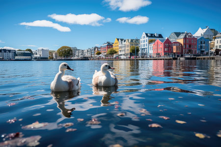 Art nouveau architectural buildings reflected in the water in the Norwegian town Aalesund