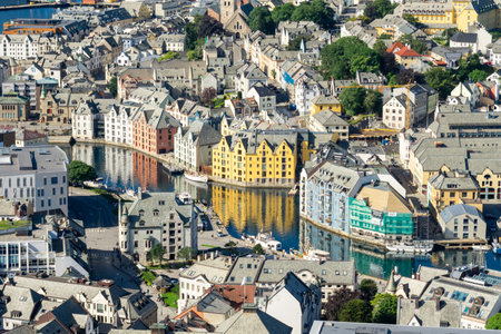 High angle view of downtown of Alesund on the west coast of Norway, with its colorful Art Nouveau buildings along the Brosundet Canal in a sunny day. Norway tourist concept