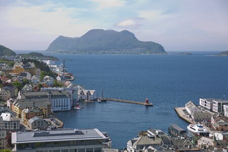 Norway. Aerial european rural city view. Alesund. Kniven viewpoint. Horizontal