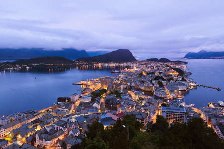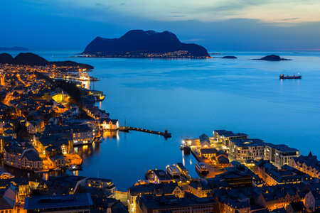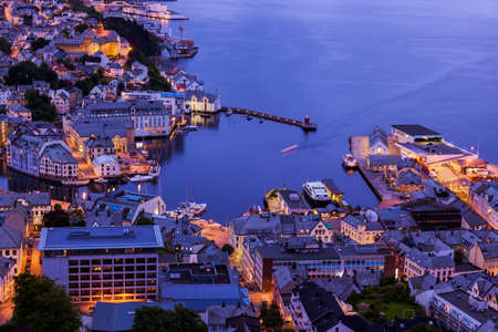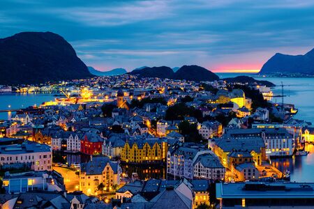 Alesund, Norway. Aerial view of Alesund, Norway at sunset. Colorful night sky over famous touristic destination with port and mountains