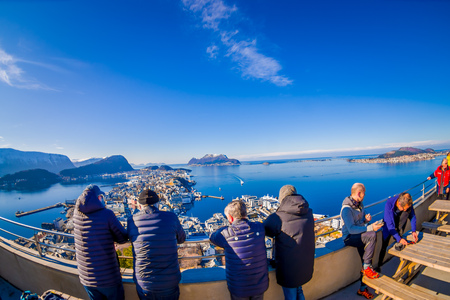 ALESUND, NORWAY - APRIL 04, 2018: Unidentified People enjoying the view and taking pictures from the birds eye view of Alesund port town on the west coast of Norway