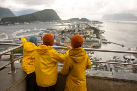 Family, kids, adults and dog, enjoying family vacation in Alesund, beautiful city in West Norway