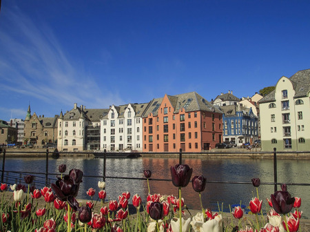 ALESUND, NORWAY - AUGUST 2017: Houses of Alesund on the waterfront