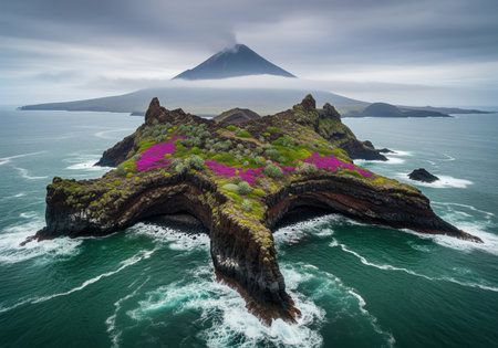 Rugged, star shaped volcanic islet covered in vibrant pink flowers and green vegetation, dramatically rising from the emerald ocean. a large, conical volcano is visible in the misty background under an overcast sky.