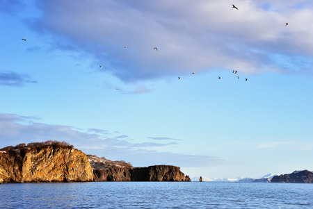 many seabirds fly over cape of island in Avacha bay of Pacific ocean on spring day near Petropavlovsk-Kamchatsky city, Kamchatka Krai, Russia