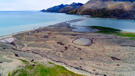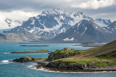 Widescreen panoramic view of South Georgia, a dreamlike island where king penguins and elephant seals say goodnight to each other
