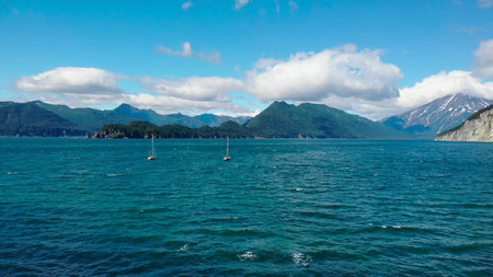 Island archipelago aerial view; volcanic mountains, turquoise waters, sailing ships; travel, tourism