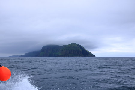 a view to Mykines Island showcasing towering cliffs surrounded by the expansive North Atlantic Ocean, Faroe Islands, Denmark