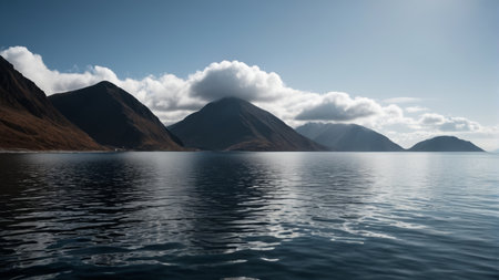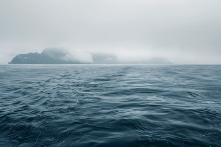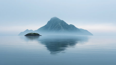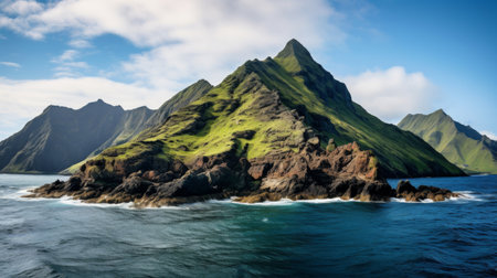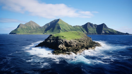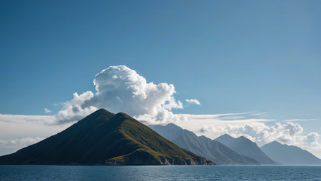 A rugged island stands tall amidst calm waters and clouds showing natures beauty and power.