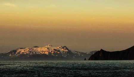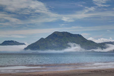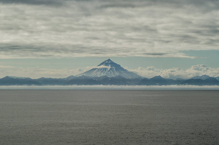 View on a Kunashir island with volcano Tyatya from the sea.
