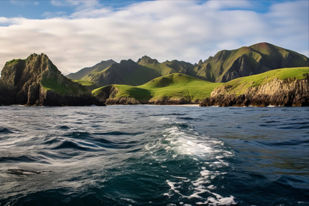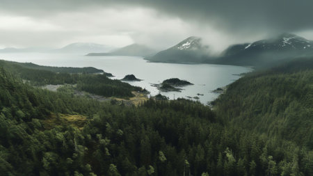 Generative AI : Aerial view of a road following the coastline along the mountain at Dutch Harbour on Amaknak Island in Unalaska Bay Alaska United States