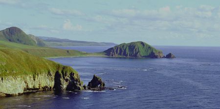 Islands with steep slopes in the Pacific Ocean. Green vegetation and bird nesting sites are visible. At the foot of the cliffs, above the water, dark caves. Kamchatka.