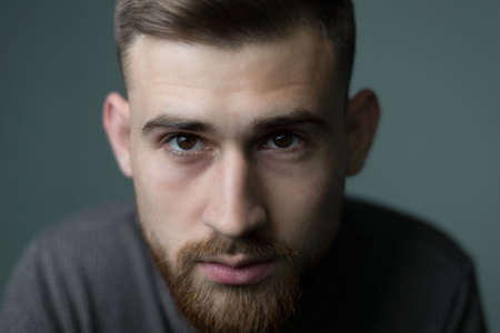 Portrait of a young bearded guy of twenty-five years old, looking at the camera, close-up. Studio photo on a gray background.