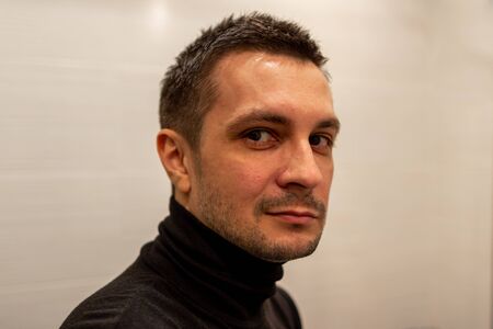 Portrait of a young short haired man wearing black turtleneck on background of light and looking at camera.