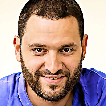 Cartoon-style portrait of person's face.