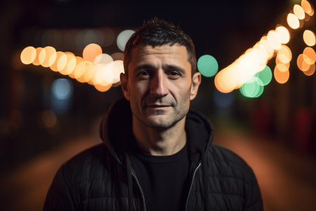 Portrait of a young man on a city street at night.